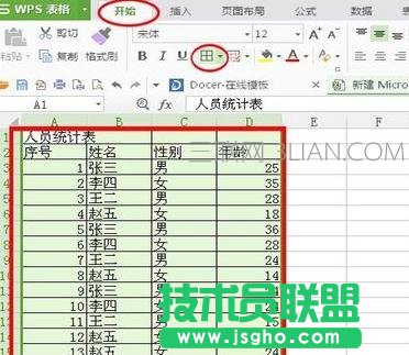 4.选中编辑的区域,然后点击菜单栏里的”开始“,再点击下方的连框选项,把该区域加上边框。如图