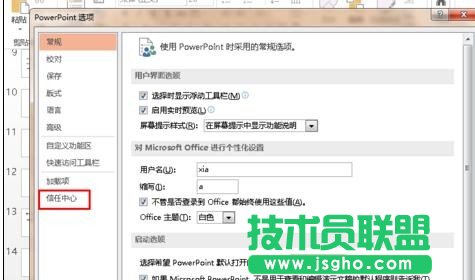 点击选项后,打开Powerpoint选项设置对话框,如下图所示,打开后默认位于“常规”页面中,点击最下面的“信任中心”