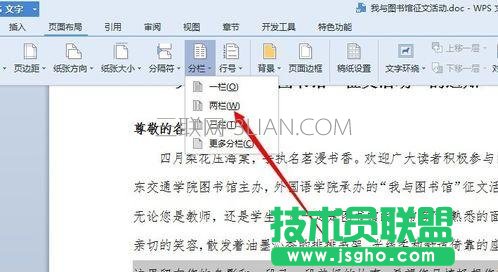 步骤三:好了,我们已经选择好我们需要分栏的文档了。然后我们去工具栏里面去找到“页面布局”——“分栏”如下图所示