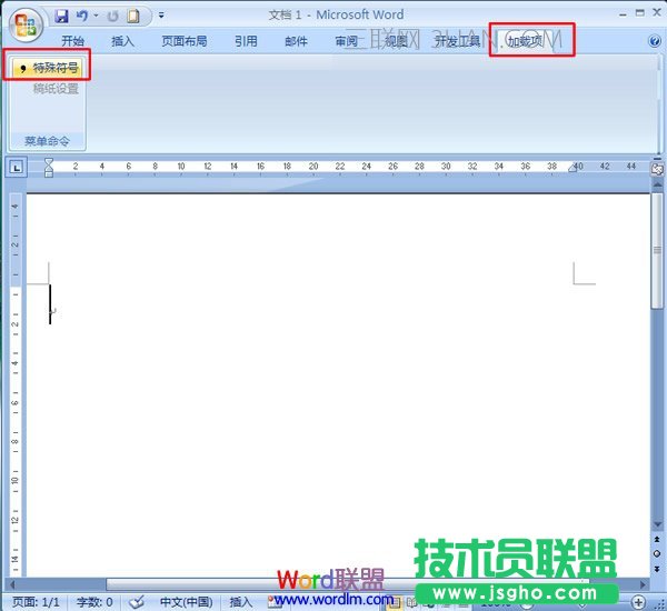 1.选择“加载项”选项卡,在“菜单命令”选项组中单击“,特殊符号”按钮。
