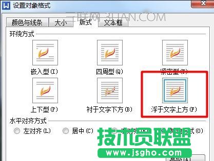 如图所示,在设置对象格式对话框下的颜色与线条,选择填充颜色:无填充颜色。线条颜色:无线条颜色。版式选择浮于文字上方,单击确定按钮。