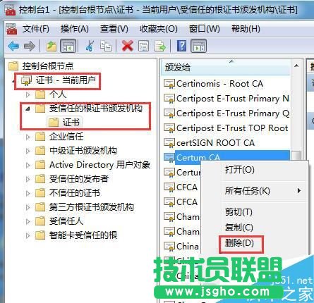 6、展开“证书”=》“受信任的根证书颁发机构”=》“证书” ,在右侧列表中查找你需要删除的证书,然后在将其删除;